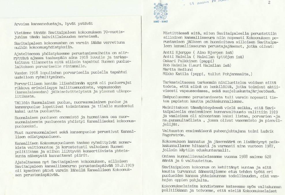 Savitaipaleen Kokoomuksella on siis ikää jo kunnioitettavat 101 vuotta.